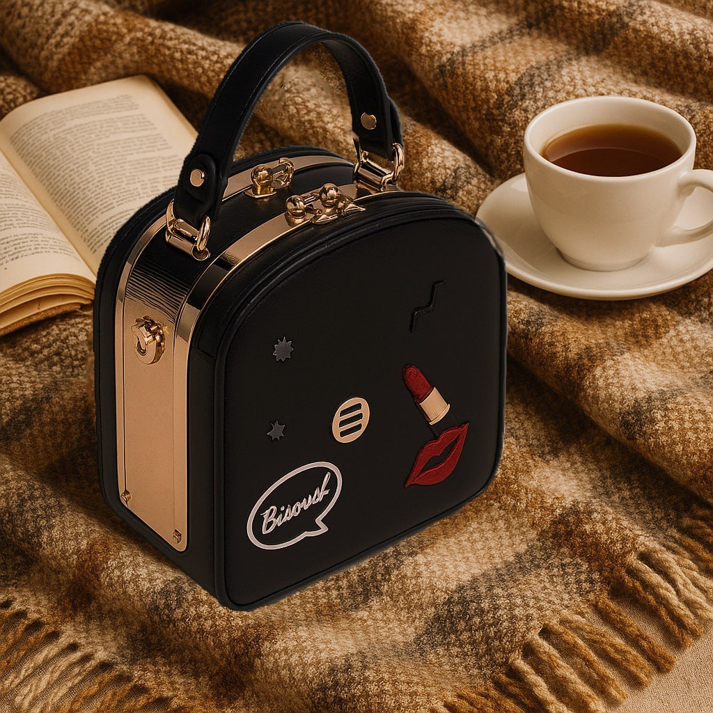 This bag is not just an accessory but a little mood inspired by Parisian streets. Its sleek black design with gold hardware is complemented by playful patches: lips, lipstick, and the word “Bisous.” It’s lightweight, stylish, and made to make you stand out.